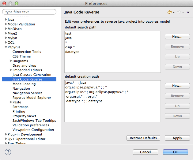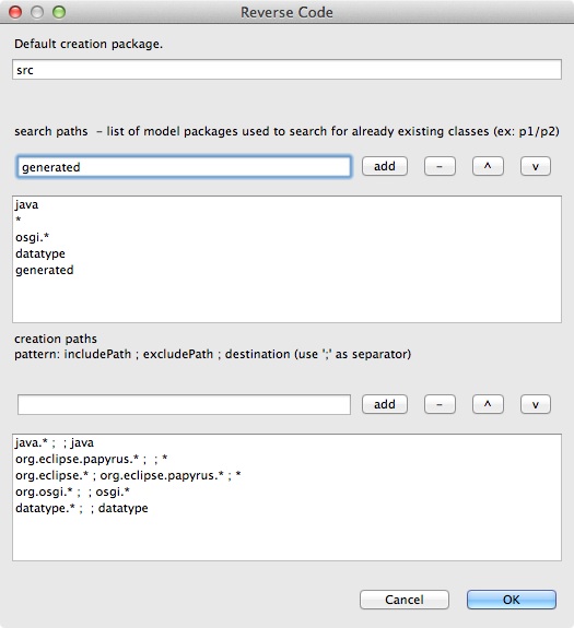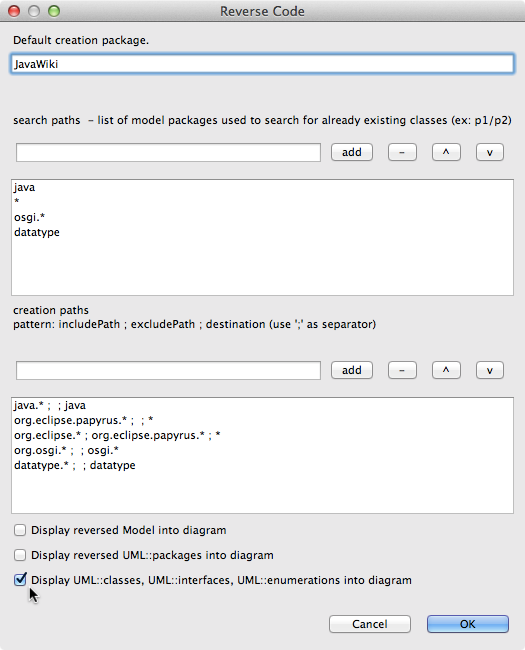 Add or remove creation path. The reverse generator search on existing Java classes to generate a UML class. Useful for creating Java imports (e.g.: String, Integer).