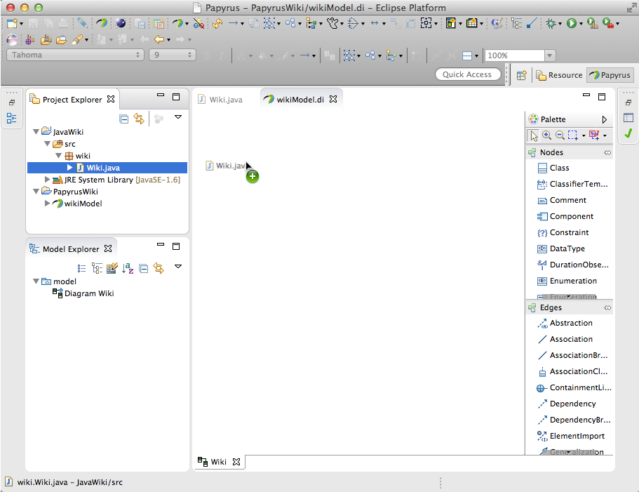 A UML class is created in Model Explorer. You can now add it to your diagram. Note that all associated classes have also been added to the model.